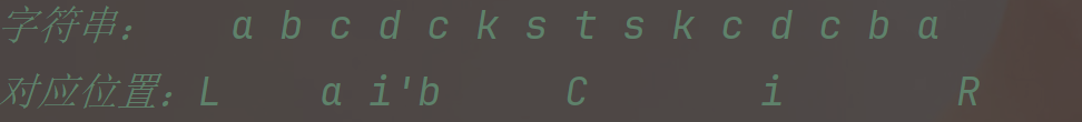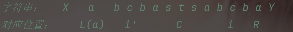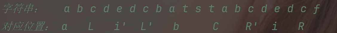 * 因为i'的回文是被L包含的,整个L和R也是相对于C对称的,i和i'也是相对于C对称的,所以i的回文字符是和i'的回文字符是相同的。