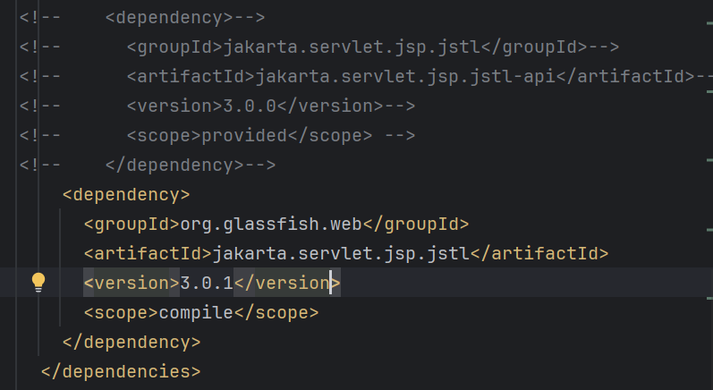 指定依赖的具体版本号,Maven 下载对应版本的 JAR 包,避免版本兼容问题 | 第一个依赖:3.0.0 → 对应 Jakarta EE 官方定义的 JSTL 3.0 接口版本;第二个依赖:3.0.1 → GlassFish 团队适配 JSTL 3.0 接口的实现版本(小版本差异是实现方的迭代,兼容 3.0 接口) |