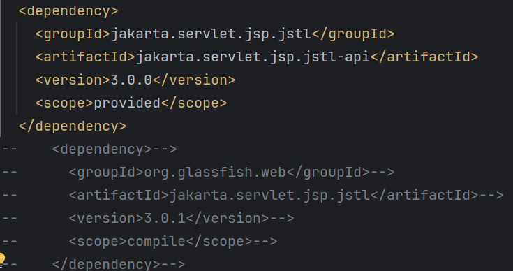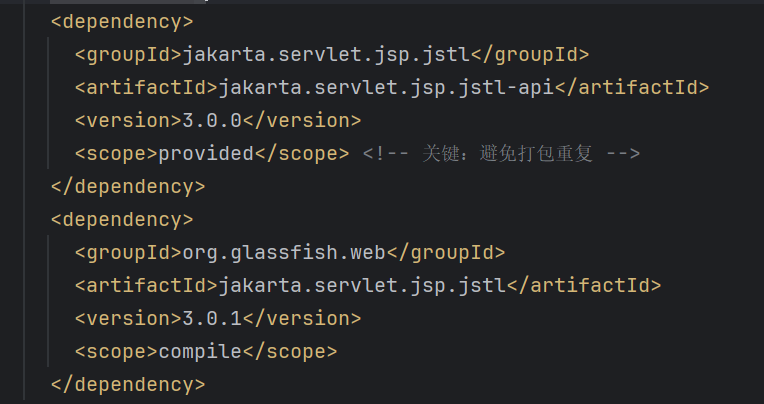 jakarta.servlet.jsp.jstl-api)仅定义标签规则,实现包(org.glassfish.web:jakarta.servlet.jsp.jstl)提供执行逻辑,二者缺一不可(无 API 则编译报错,无实现则运行报错)- 必须配 scope: