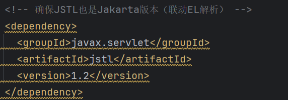 - 第一个依赖(jakarta.servlet.jsp.jstl-api:3.0.0) :Jakarta EE 官方提供的「JSTL 3.0 规范接口包(API)」,仅含