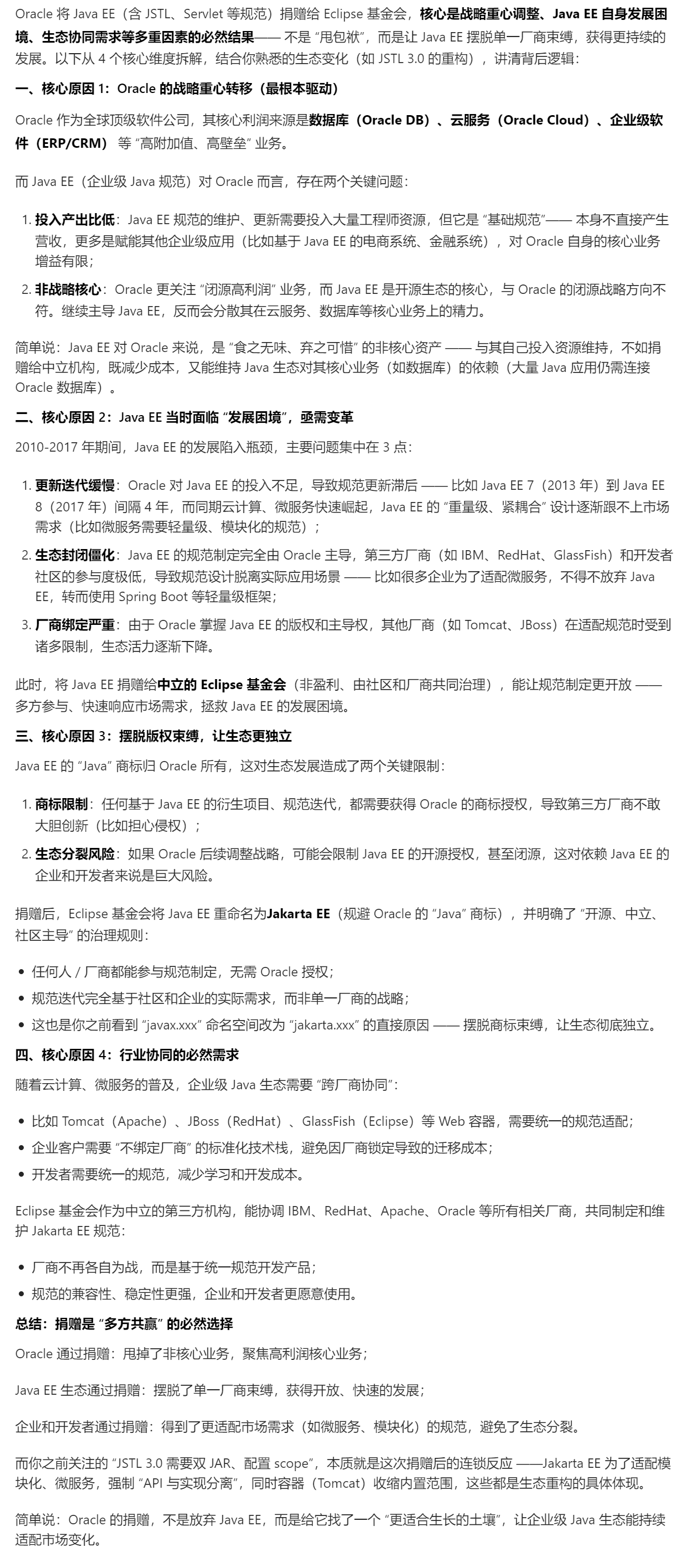 下面如果你还有兴趣,我们再打深一层,来看看Oracle 为什么将 Java EE(含 JSTL、Servlet 等规范)捐赠给 Eclipse 基金会