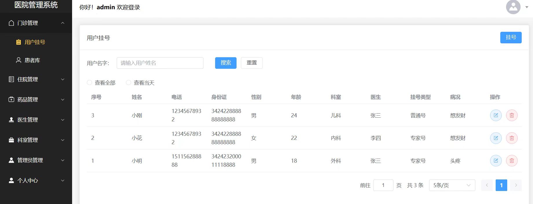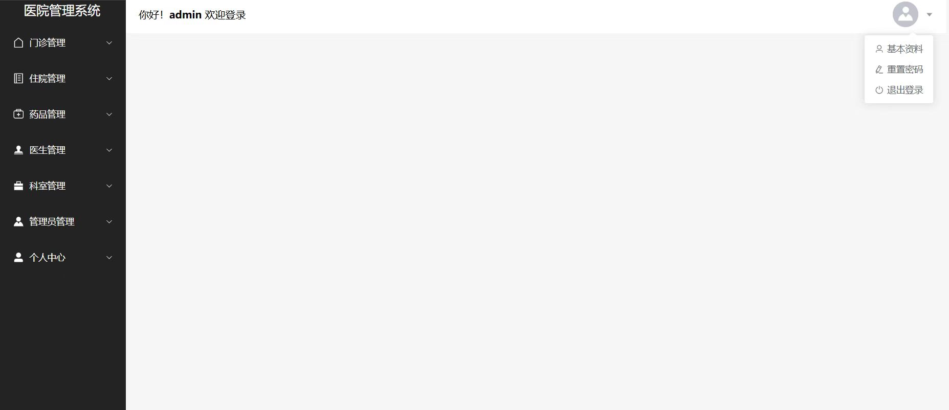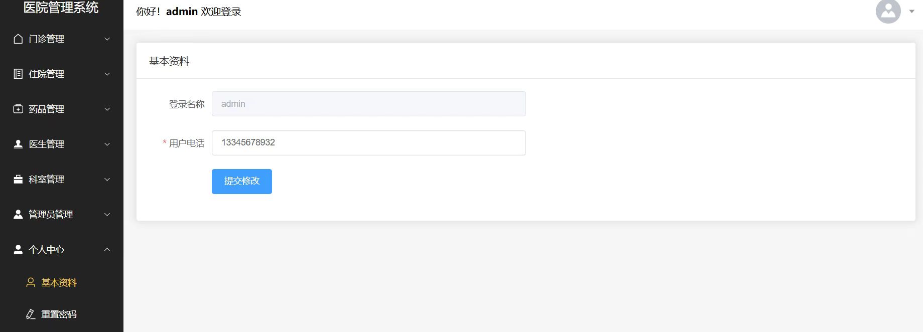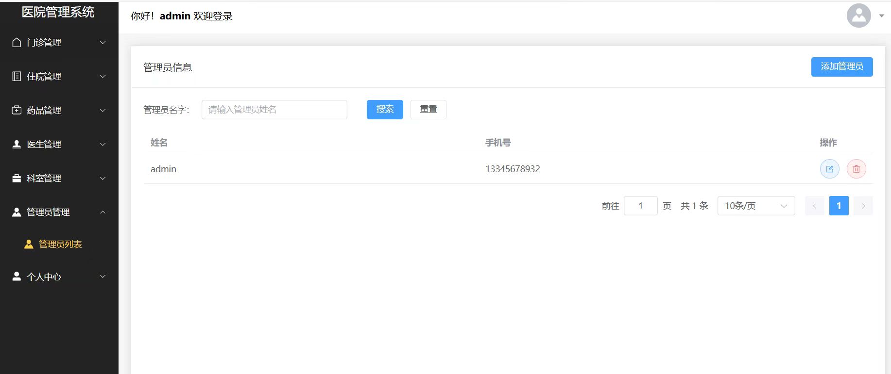 管理员可以进行挂号管理,住院管理,药品管理,医生管理,科室管理,管理员管理,还可以对个人信息进行修改,密码的修改