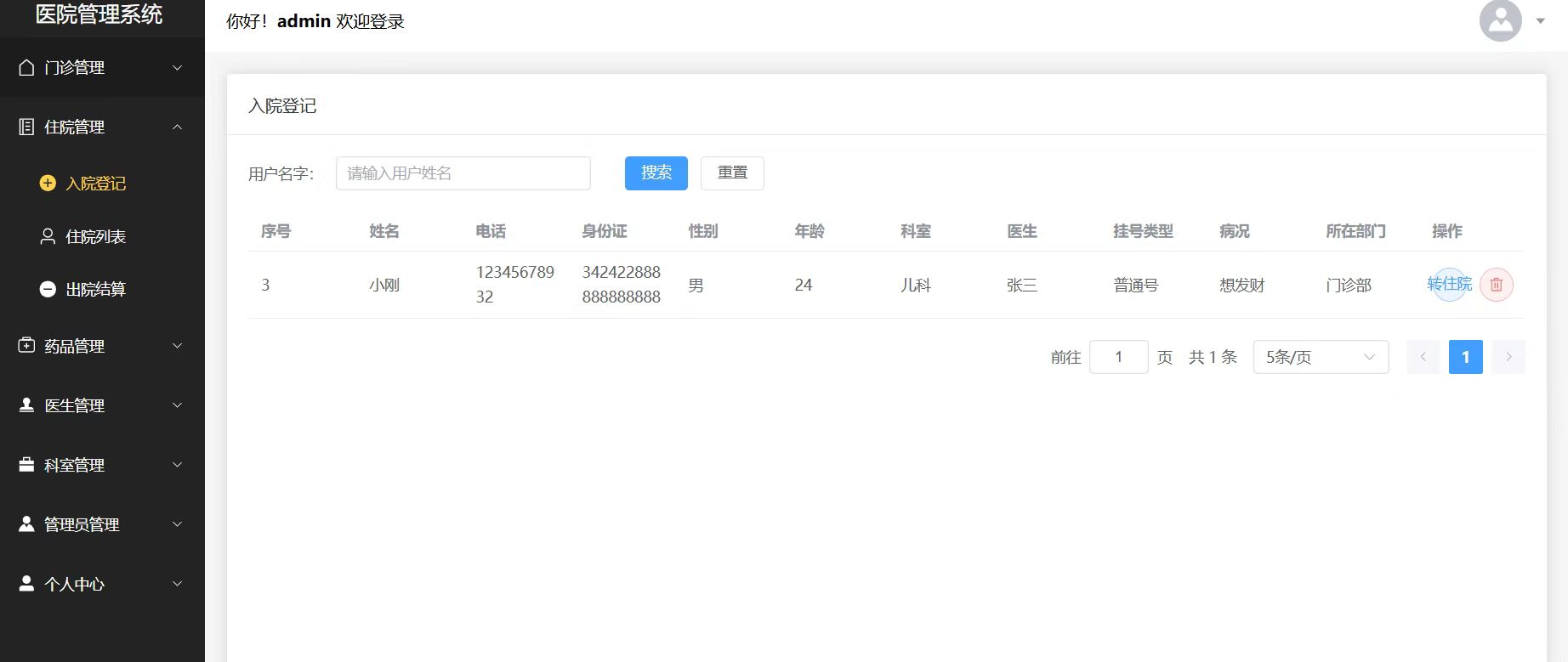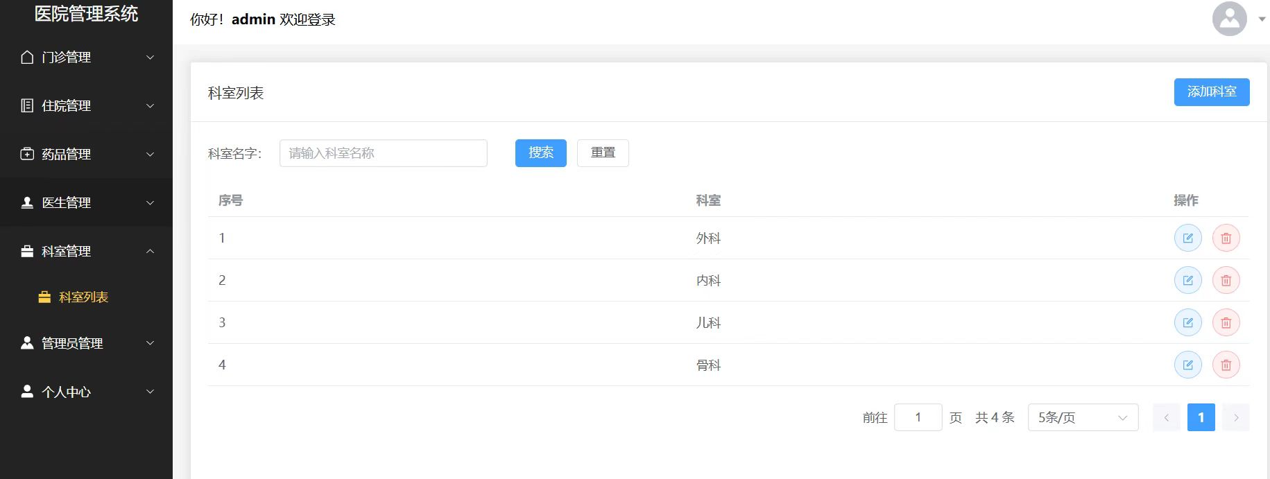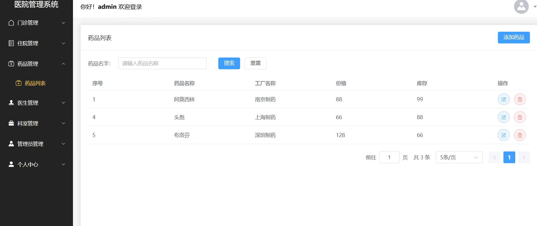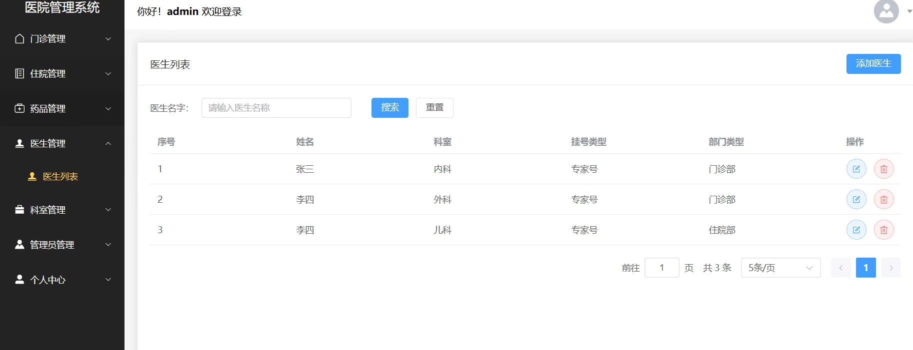 管理员可以进行挂号管理,住院管理,药品管理,医生管理,科室管理,管理员管理,还可以对个人信息进行修改,密码的修改