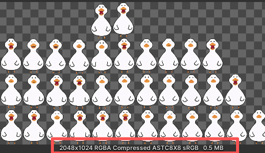 比如上面这个图集大小是2048×1024,RGBA Compressed ASTC 8×8,在运行时占用的纹理内存大约是 0.5MB(显存),如果是 RGBA32 则约为 8MB。