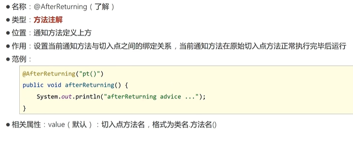 java@AfterReturning(value = "pct()",returning = "ret")// 指定ret用于接收原始方法的返回值 public void afterReturning(Object ret){ System.out.println("afterReturning advice ..."); System.out.println("ret: "+ret); } -