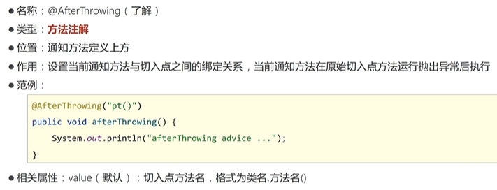 java@AfterThrowing(value = "pct()",throwing = "t")// 指定t用于接收原始方法的异常 public void afterThrowing(Throwable t){ System.out.println("afterThrowing advice ..."); System.out.println("exception: "+t); } -