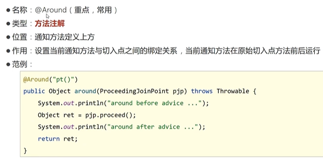 java@Around("pct()") public Object around(ProceedingJoinPoint pjp) throws Throwable { Object ret=pjp.proceed(); return ret; }
