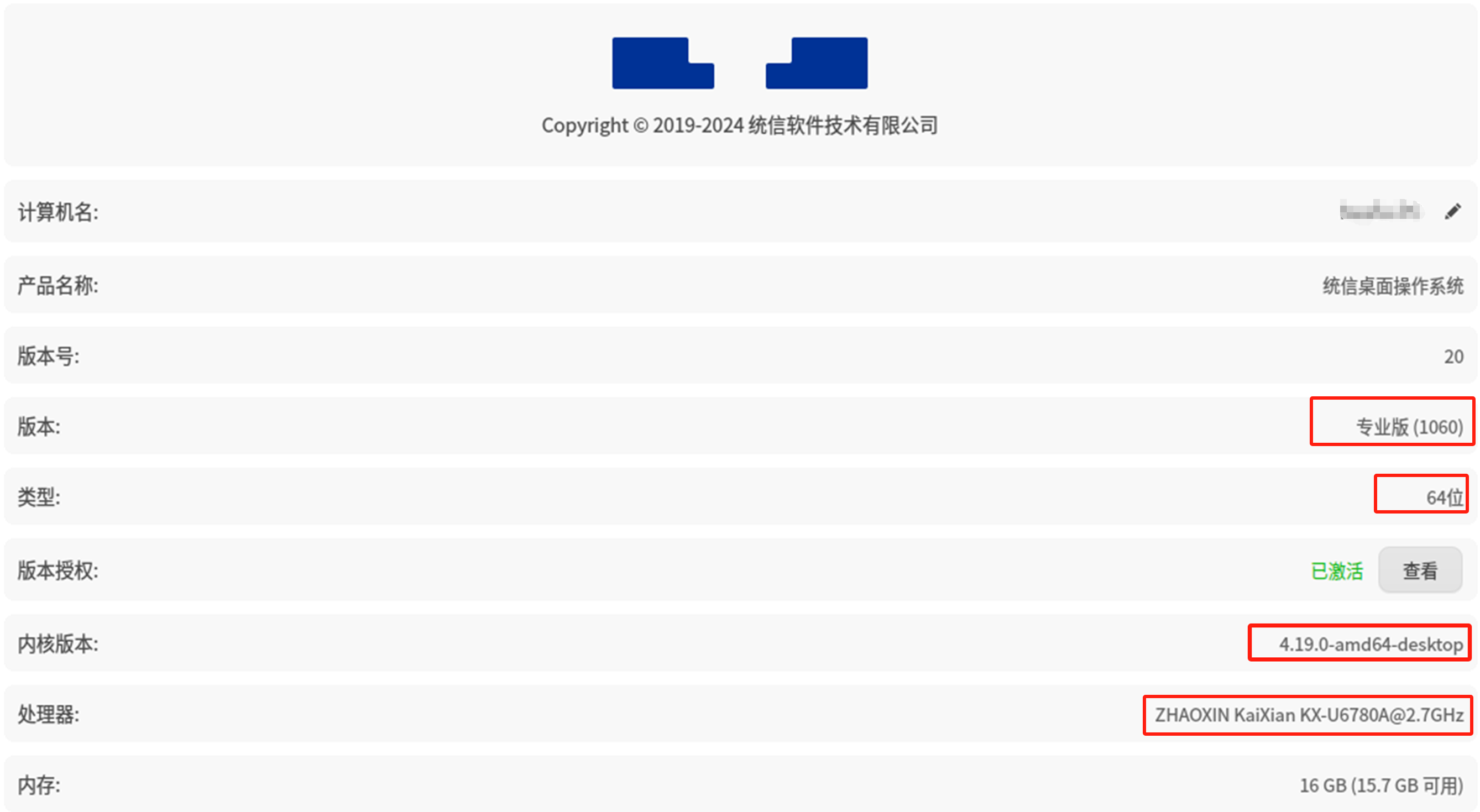 统信桌面操作系统:内核4.19.0-amd64-desktop,专业版(1060)