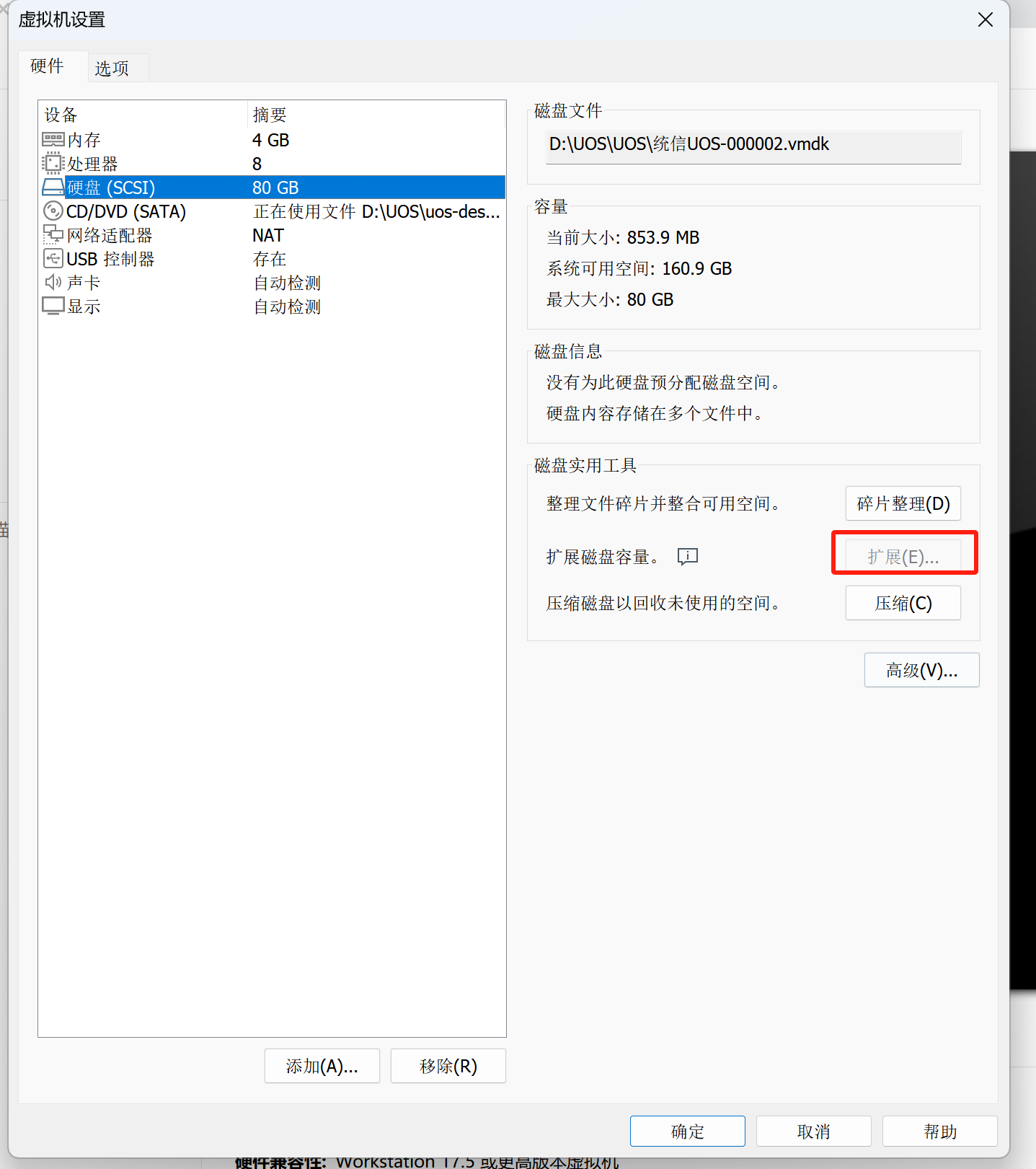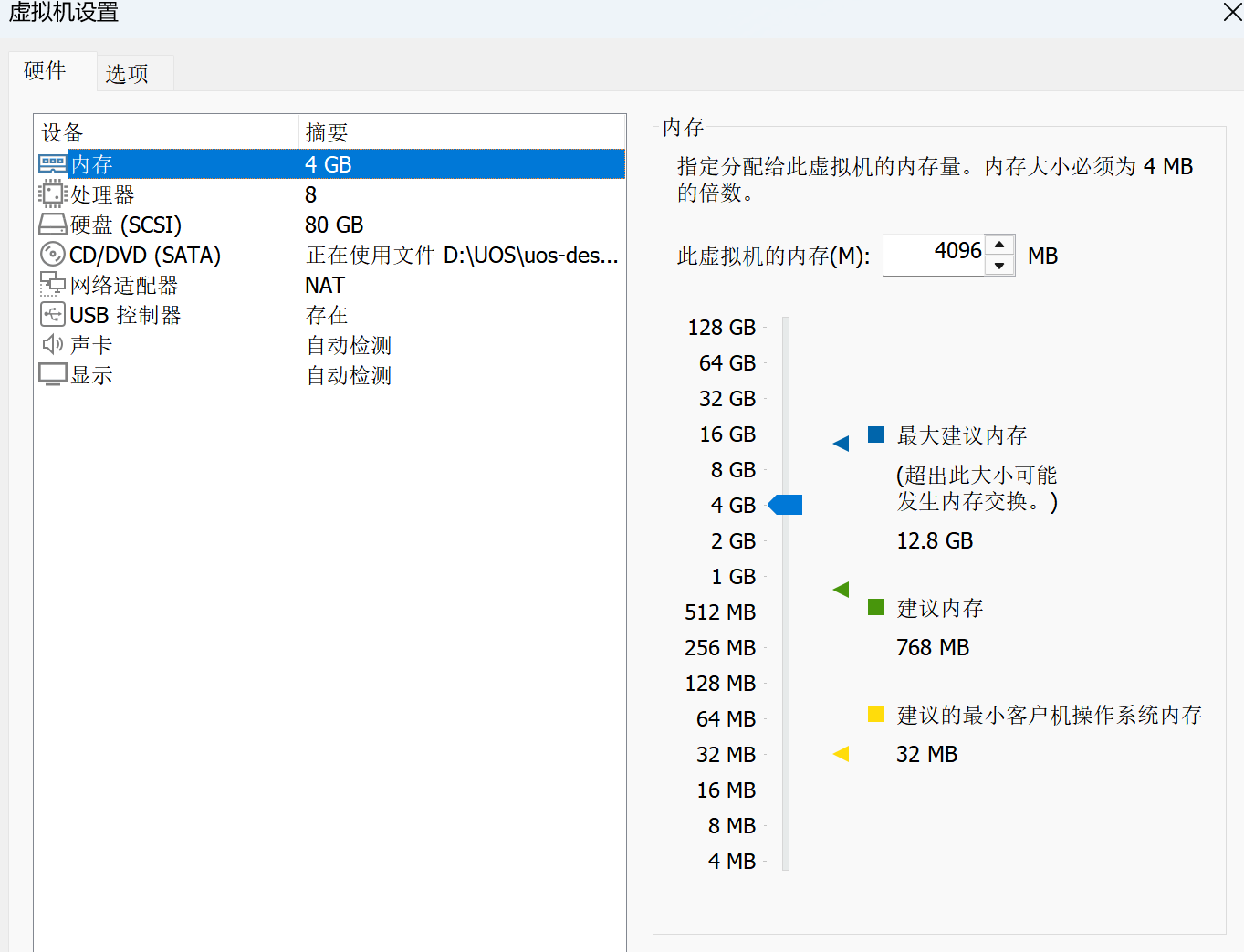 这个是虚拟机设置的参数,内存和处理器之前默认的在启动虚拟机的时候太慢了,我把它等比扩大了,硬盘内存刚开始设置20GB,但是在统信UOS进行桌面初始化的时候提示"初始化环境失败",要求硬盘最少70GB,然后我对硬盘进行扩展之后就成功初始化了系统