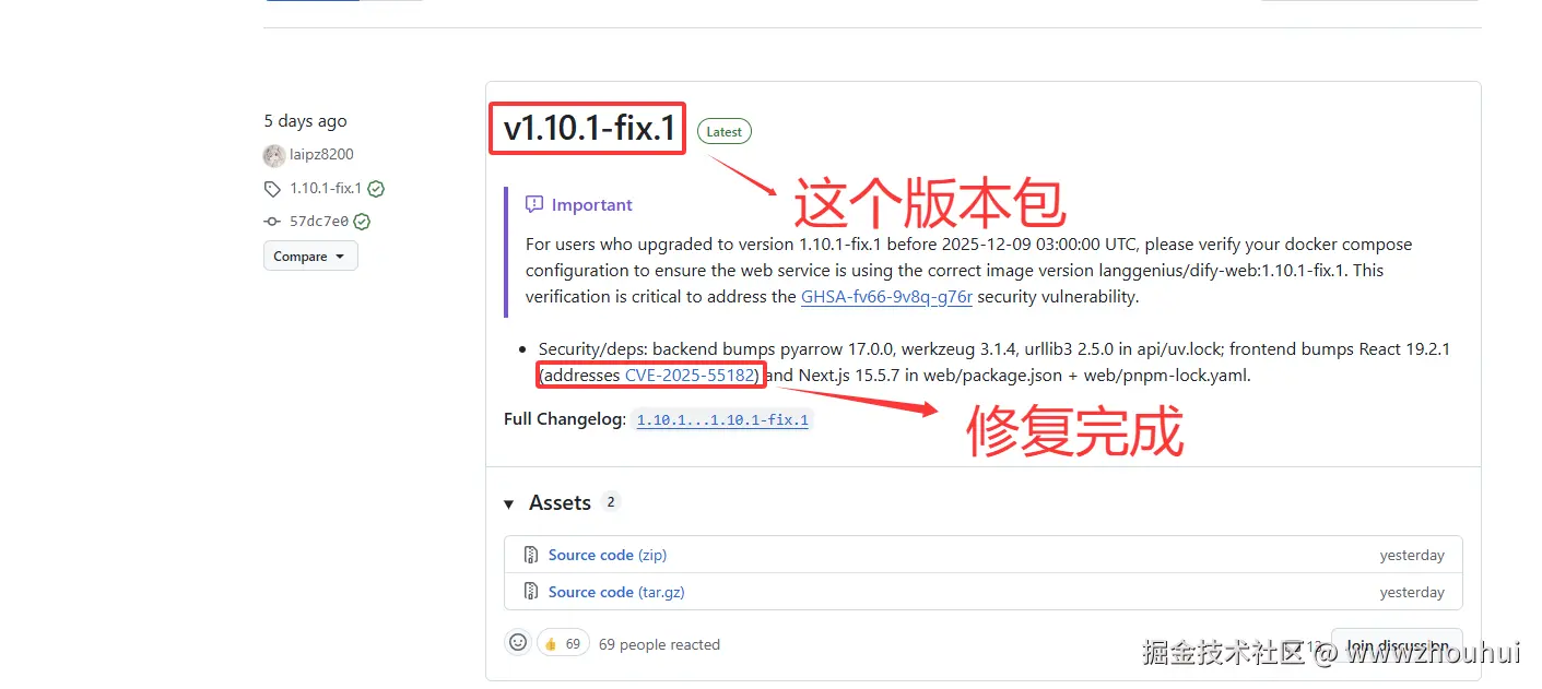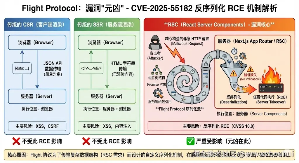 在实际应用中,该修复方案不仅解决了React生态史上最严重的安全漏洞威胁,还通过对比CSR/SSR/RSC三代架构演进揭示了Flight协议设计缺陷的根本原因,技术深度远超简单的"打补丁"操作;特别是通过真实的生产环境WAF拦截案例、官方镜像标签错误踩坑经历、周末紧急升级与周一复测失败的血泪教训等关键信息点,有效帮助小伙伴们避开升级过程中12月6-8日期间docker-compose.yaml配置文件未更新-fix.1后缀的致命陷阱。