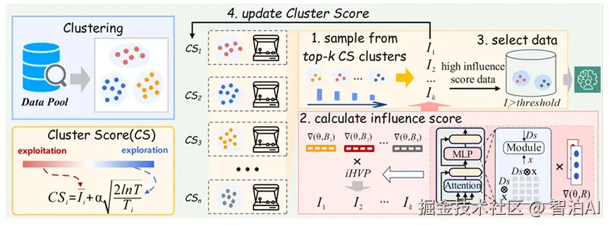 该方法首先采用高效的反向Hessian计算技术,量化每条数据对模型训练的影响权重。随后将语料库基于语义表示划分为多个簇,每个簇被建模为多臂赌博机问题中的一个独立"臂"。