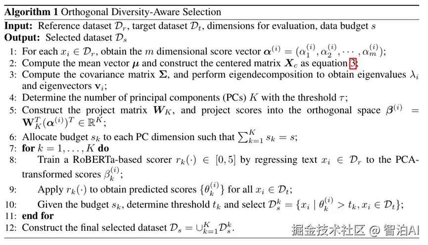在构建训练集时,该方法并非简单选取总体评分最高的数据,而是从每个正交维度分别筛选高分数据(或按比例采样),从而既保证多维覆盖又维持数据多样性(因不同维度的最优数据通常具有差异性)。