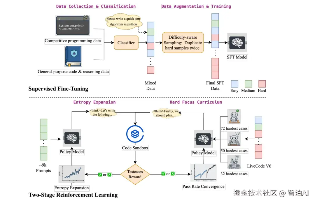 第二阶段:筛选极端困难样本,通过64次rollout的阶梯式训练(分三阶段逐步强化),不断推动模型突破性能极限。