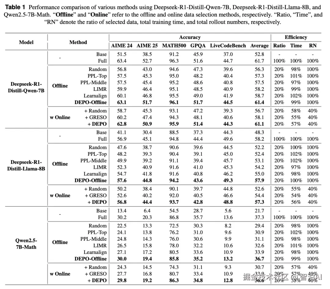 本文在三个模型和五个推理数据集上都进行了详细的实验,实验结果表明 DEPO 在各个数据集上都展现出强大的性能和效率优势。