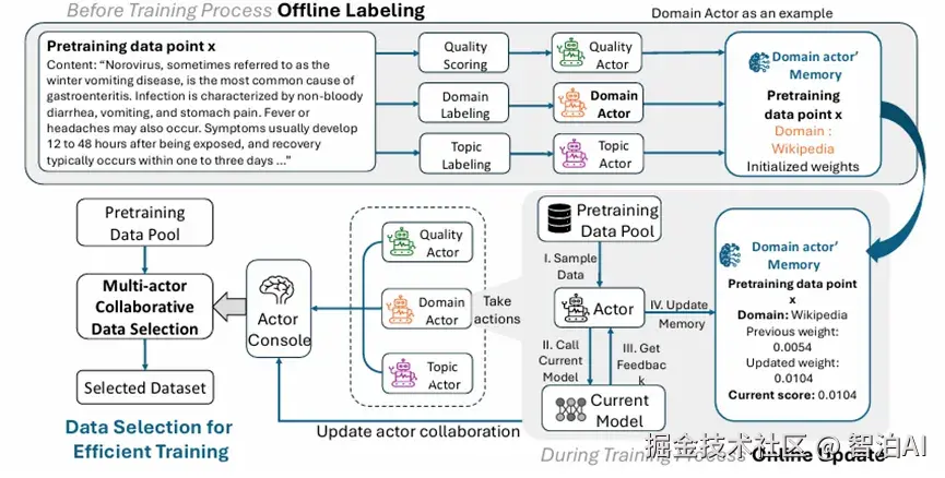 影响力智能体(influence)评估数据对模型的关键作用,领域混合智能体(domain mixing)优化跨领域数据配比。