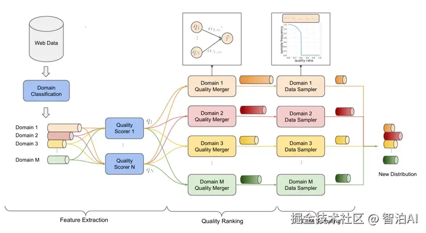 动态采样机制:基于"质量向量+领域标签"的复合函数计算采样概率,并通过小规模实验优化参数配置