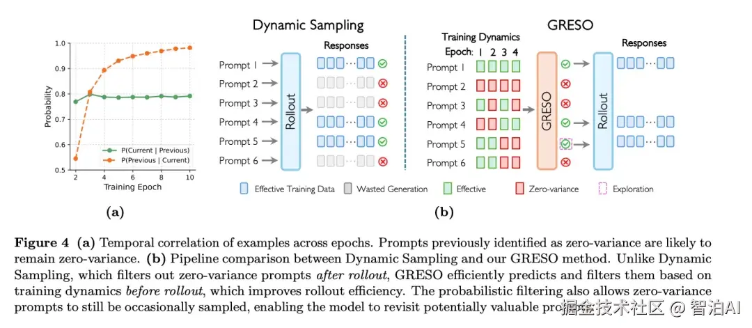 在线rollout效率问题:现有方法(以GRESO为例)仅能对零方差样本进行粗略筛选,无法有效识别具有高探索潜力的样本,导致大量计算资源被低贡献样本占用。