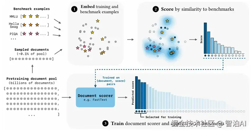 继而借助轻量分类器将排序策略泛化至全量语料库;最终筛选出与目标任务分布匹配度最高的训练数据。