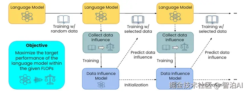 实施流程包含:训练周期内通过周期性探测(probe)量化各数据样本对模型性能的实际贡献度,利用该评估结果训练轻量级预测模型,进而预判海量语料中每项数据的潜在价值权重。