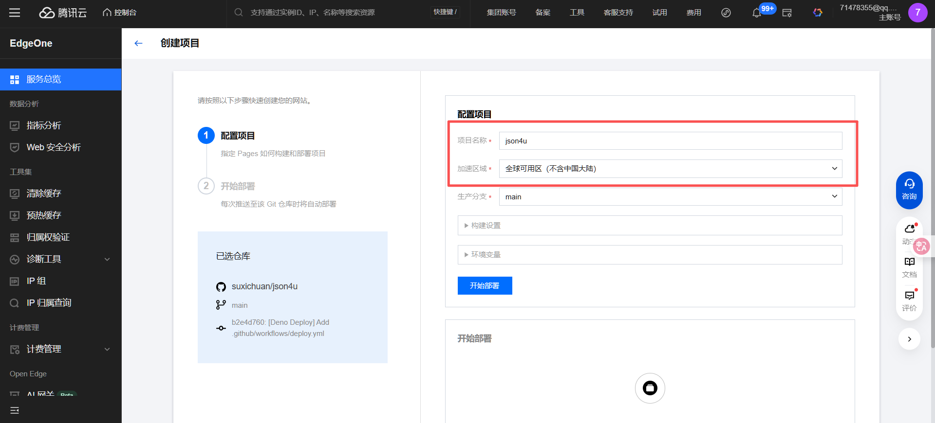 然后【项目名称】自定义,加速区域选择有域名备案的选择【全球可用区(包含中国大陆)】,没有备案的选择【全球可用区(不含中国大陆)】。其他默认,点击部署即可。