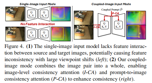 注:(左)单图像模式缺乏图像间特征交互,视角变化大时特征不一致;(右)耦合图像模式通过图像级一致性注意力(I-CA)和提示词到图像一致性注意力(P-CA)增强跨视角一致性。