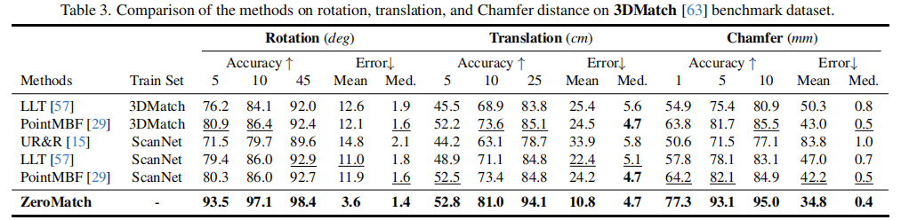表 3 展示了 3DMatch 数据集的对比结果,ZeroMatch 与 UR&R、LLT、PointMBF 三种方法进行比较。