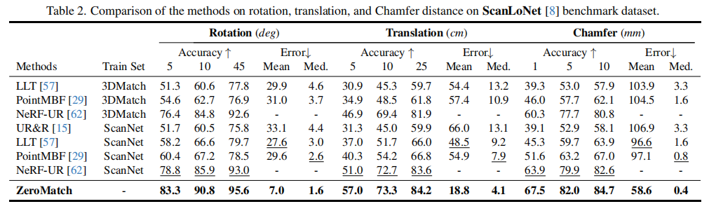 表 2 展示了低重叠场景下的对比结果,ZeroMatch 与 4 种 SOTA 深度 RGB-D 方法(UR&R、LLT、PointMBF、NeRF-UR)进行比较。