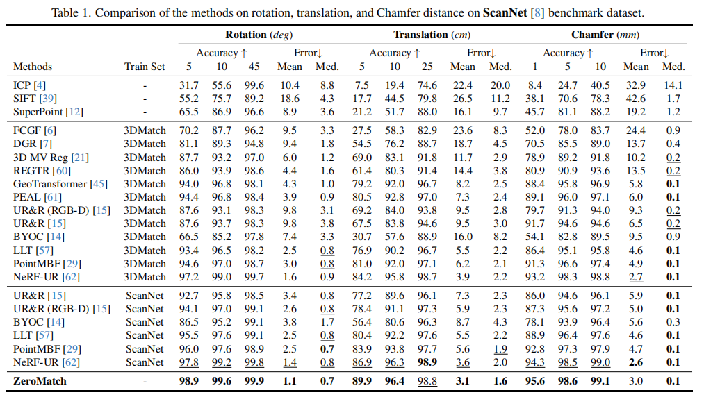 - 在 ScanNet、ScanLoNet、3DMatch 三个数据集上的大量实验表明,ZeroMatch 显著优于现有 SOTA 方法,验证了其在常规场景和低重叠、重复模式等复杂场景中的强鲁棒性。