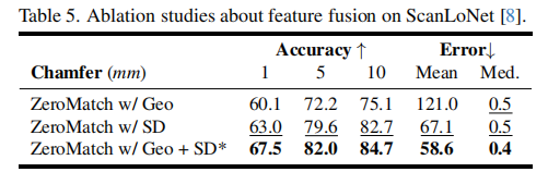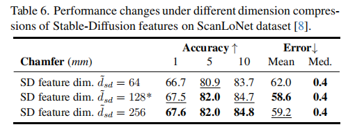 表 5 对比了仅使用几何特征(Geo)、仅使用 Stable Diffusion 特征(SD)和融合特征(Geo+SD)的性能: