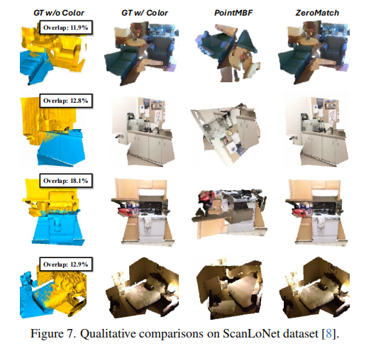- 图 7 展示了定性结果,ZeroMatch 在重叠率仅 11.9%-18.1% 的场景中,仍能实现精准配准。