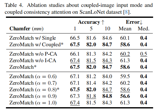 表 4 第二组对比了移除 P-CA(ZeroMatch w/o P-CA)和移除 I-CA(ZeroMatch w/o I-CA)的性能: