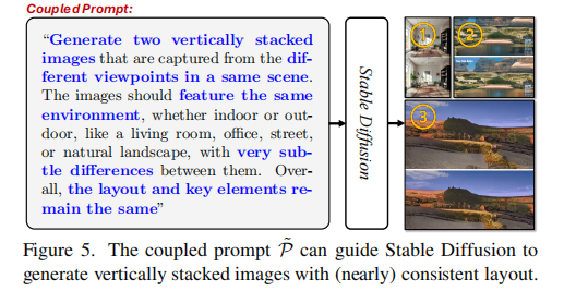 提示词到图像耦合一致性注意力(P-CA)设计耦合提示词(如图 5 所示):"生成两张垂直拼接的图像,来自同一场景的不同视角,场景环境(室内 / 室外)相同,布局和关键元素保持一致,仅存在细微差异"。