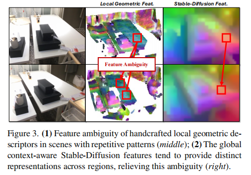 如图 3 右侧所示,通过 t-SNE 可视化的 Stable Diffusion 特征,在不同场景区域呈现出明显的区分性,表明其能够有效编码空间结构和关系上下文等全局信息,可有效缓解 FPFH 的特征歧义问题。