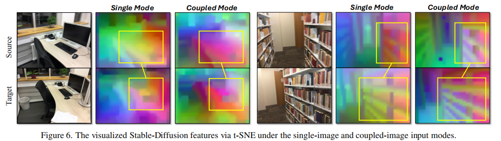 结论:耦合图像输入模式相比单图像模式,在所有指标上均有提升,证明其能有效增强跨视角特征一致性。图 6 的 t-SNE 可视化进一步验证了这一点 ------ 耦合模式下源图像和目标图像的对应区域特征更集中、更对齐。