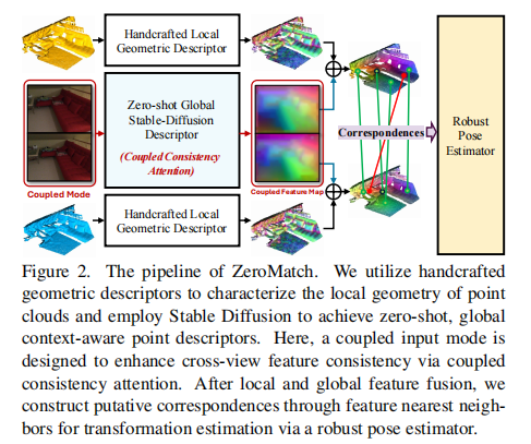 ZeroMatch 的整体 pipeline 如图 2 所示,主要包含三个核心模块:手工局部几何描述符提取、零样本全局 Stable Diffusion 描述符提取(含耦合图像输入模式)、特征融合与姿态估计。