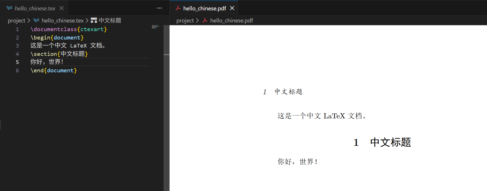保存后,LaTeX Workshop 就会使用 XeLaTeX 编译,这种编译方式对 中文文档非常稳定。