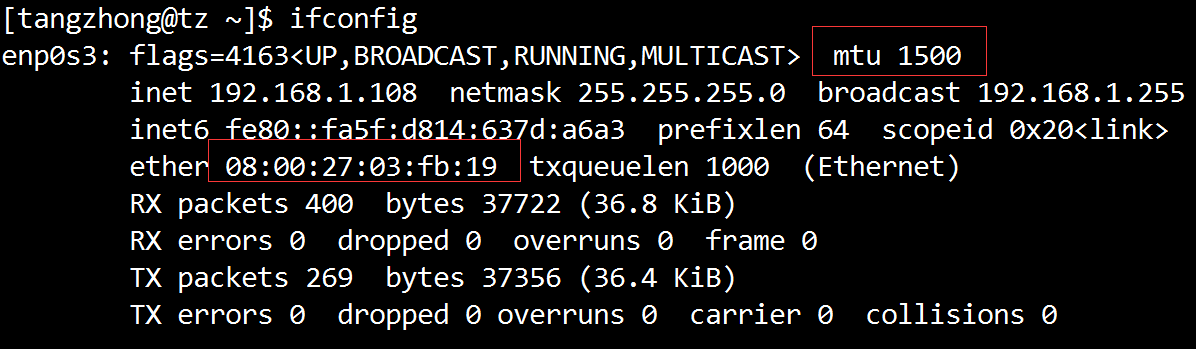 使⽤ifconfig命令, 即可查看ip地址, mac地址, 和MTU;