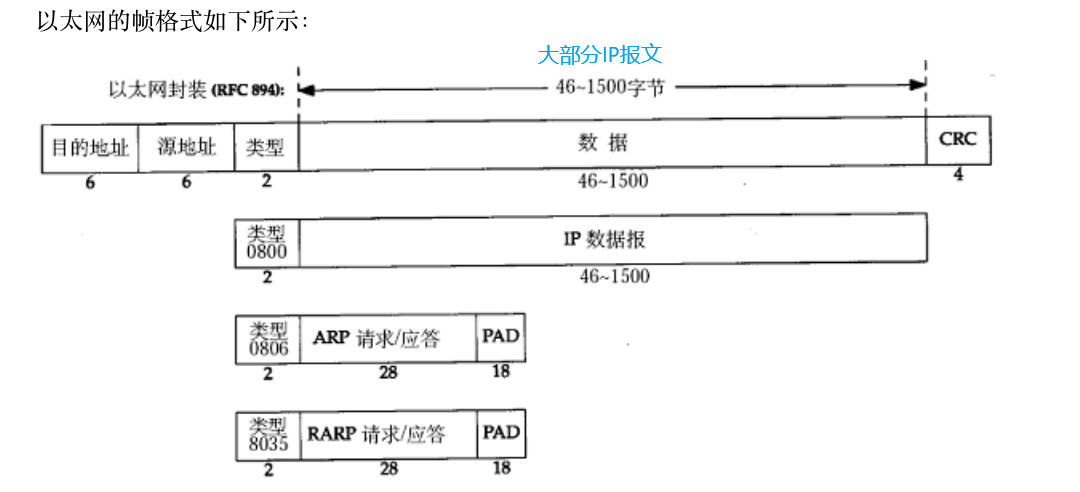 • 帧协议类型字段有三种值,分别对应IP、ARP、RARP;