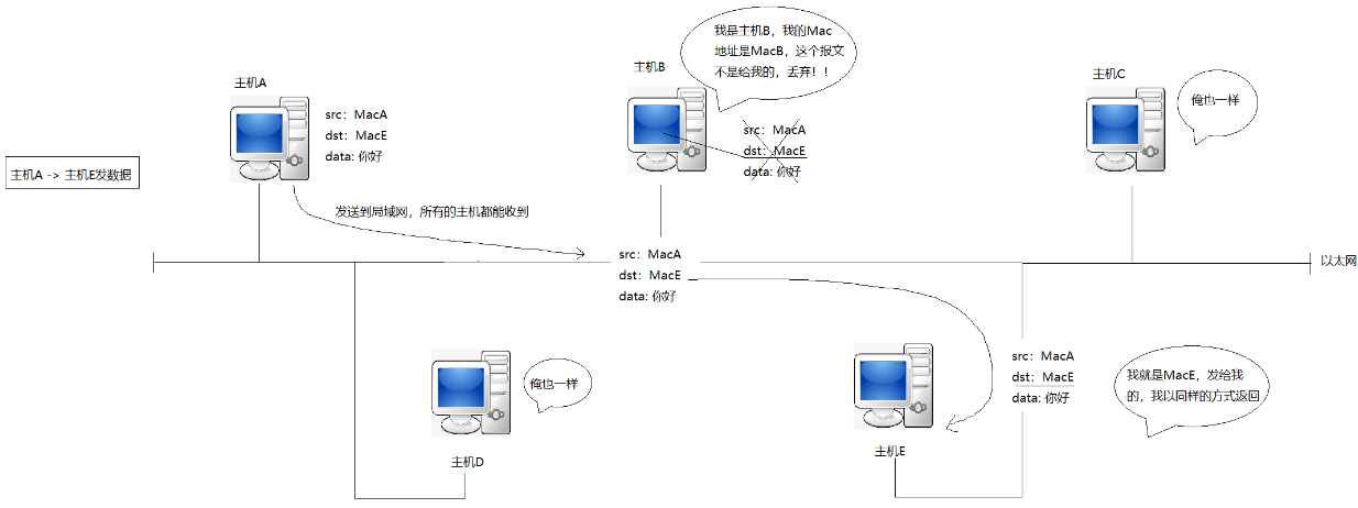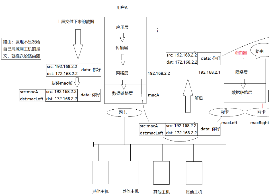 数据包⾸先是被⽹卡接收到再去处理上层协议的,如果接收到的数据包的硬件地址与本机不符,则直接丢弃;