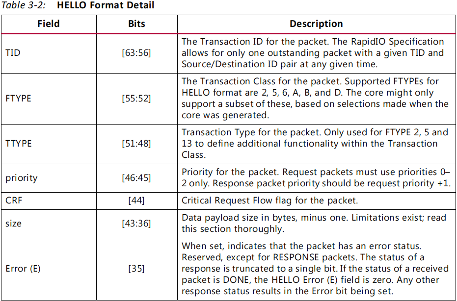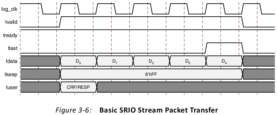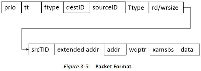 在上图流模式中,数据包完全按照RapidIO规范中的定义呈现,包括所有逻辑/传输层字段(加上规范定义为物理层字段的优先级)。所有类型的SRIO数据包格式见下图。数据字节在以这种格式呈现给LOG之前必须反转,以符合AXI4流协议。链路接口(BUF和PHY之间)和传输接口(LOG和BUF之间)上的数据包使用SRIO流格式。