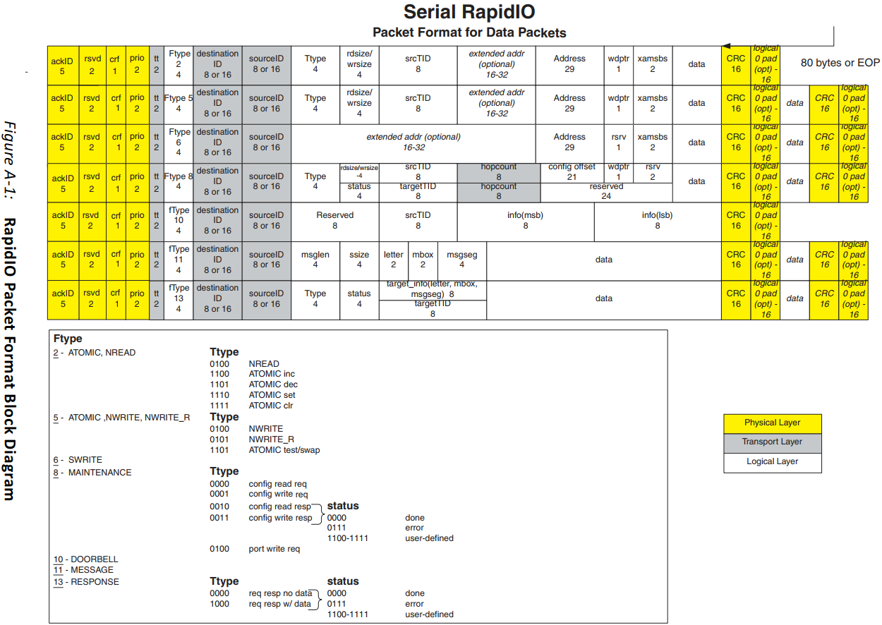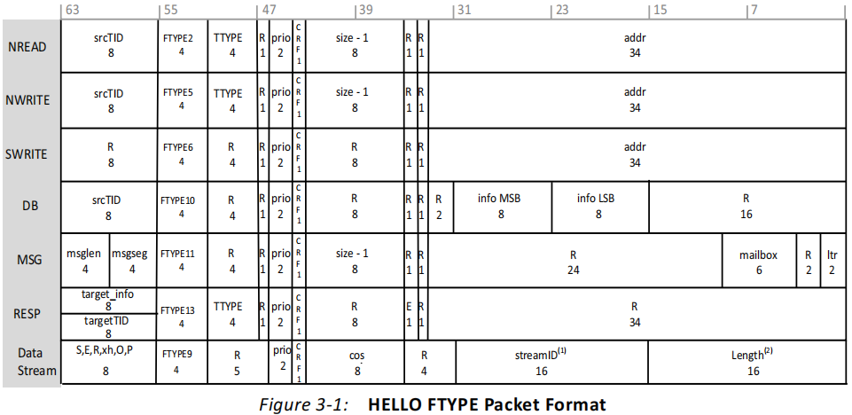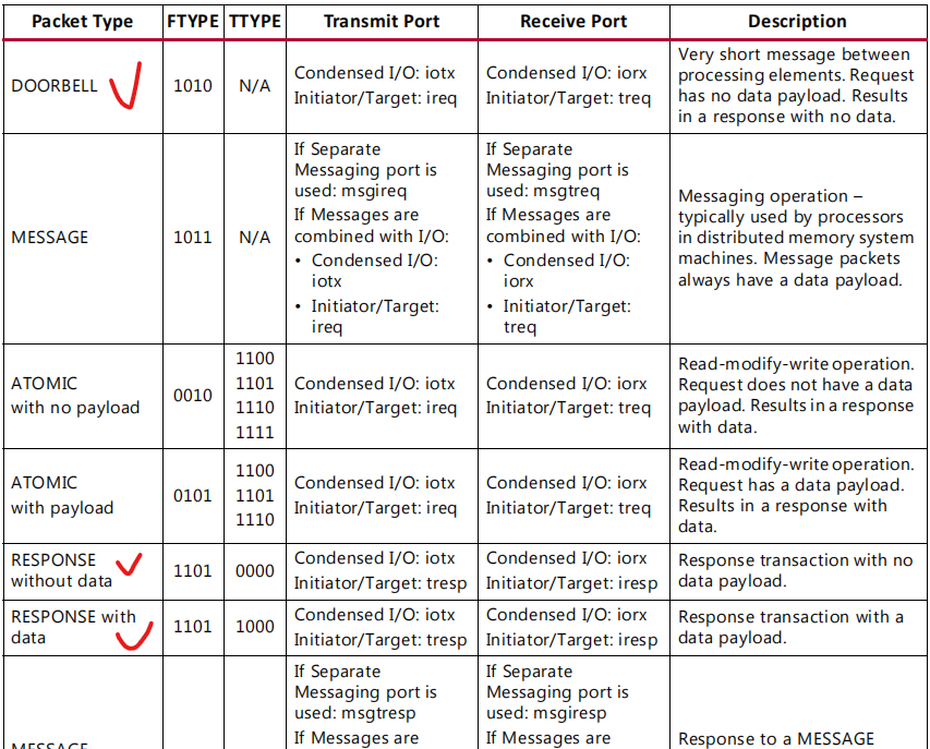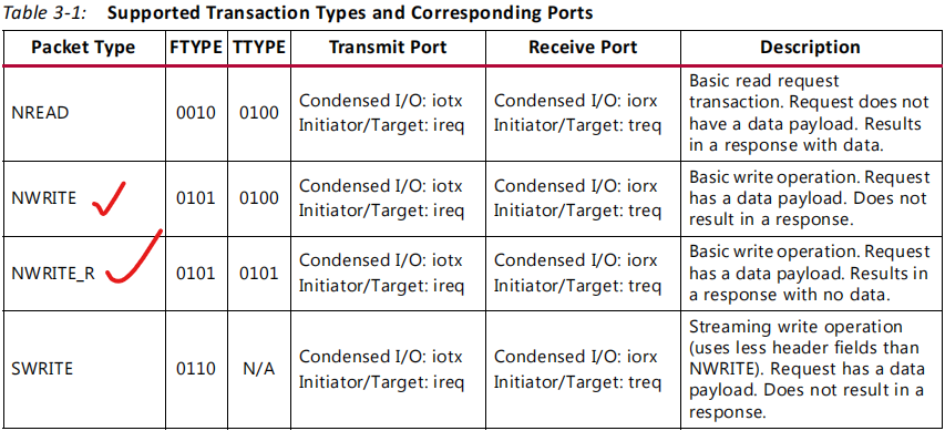 事务类型主要有:由Ftype和Ttype字段决定,FPGA中常用的NWRITE、NWRITE_R、DOORBELL、NREAD、RESPONSE(有无数据)。