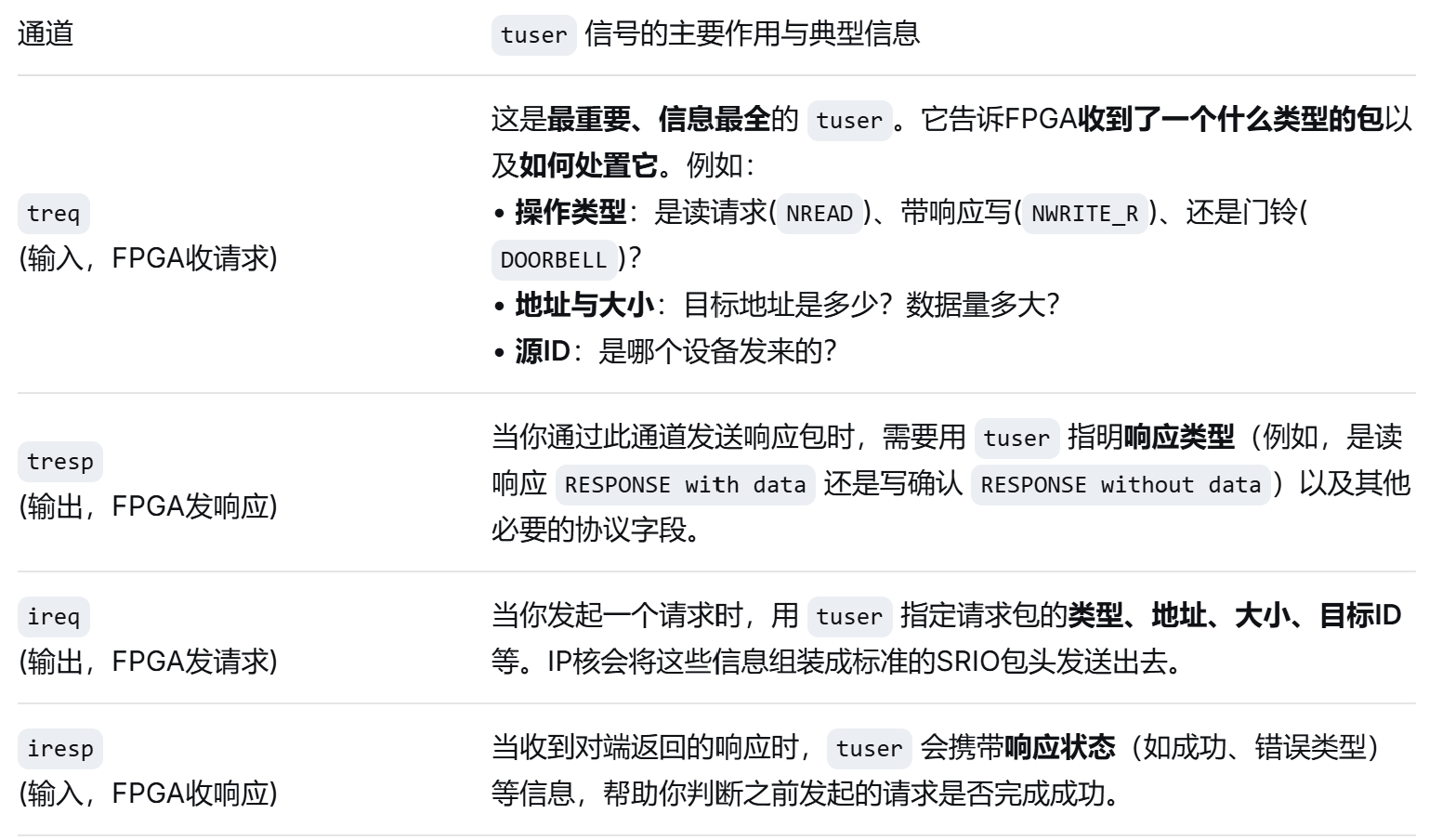 在 Xilinx SRIO IP 核的 AXI4-Stream 接口中,tuser 信号是一个关键的用户侧信号 ,用于在传输主数据(tdata)的同时,传递与数据包相关的额外控制信息或元数据 。简单来说,tdata 传输的是"有效载荷",而 tuser 传输的是关于这个有效载荷的"说明信息"。tuser 信号的具体含义和位宽会根据它所在的通道(ireq, iresp, treq, tresp)而不同。通常,它用于携带 SRIO 数据包的包头(Packet Header)中的关键字段,以便你的用户逻辑能正确解析和处理数据包。