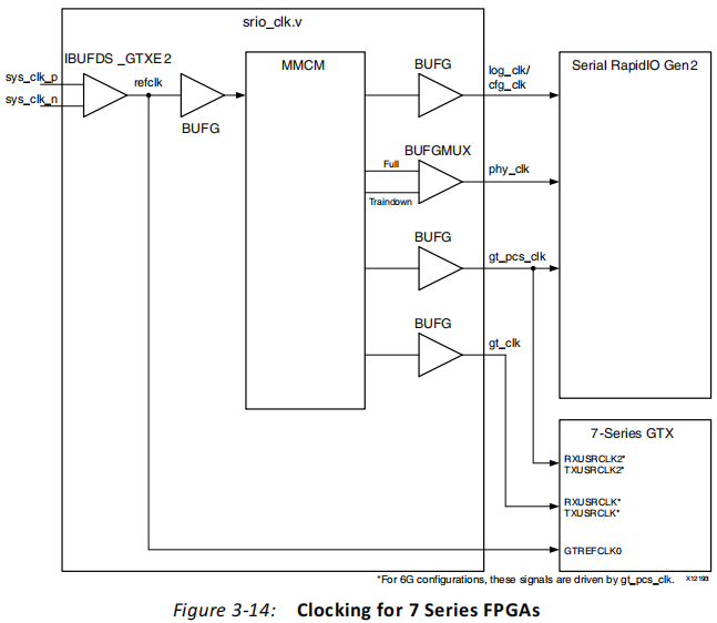 上述时钟框架中:phy_clk是主内核时钟,gt_pcs_clk用于GT与PHY通信的时钟信号(usrclk2),gt_clk是GT内PCS与PMA并行数据的时钟信号(usrclk???)。log_clk为SRIO逻辑层的数据、配置等时钟。cfg_clk(7系列芯片)为SRIO配置接口时钟,与log_clk时钟相同。gt_pcs_clk的时钟频率=gt_clk/2 (usrclk2是usrclk频率的一半),phy_clk=(gt_clk *lane数目)/4。为了防止BUFFER溢出,log_clk应不低于phy_clk,且log_clk与phy_clk同步。
