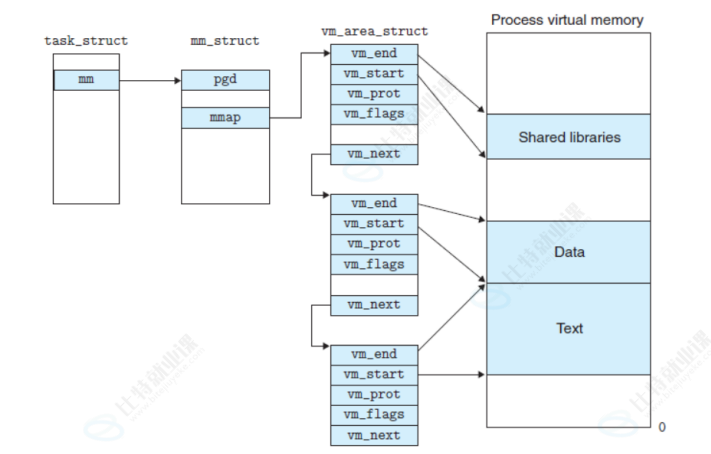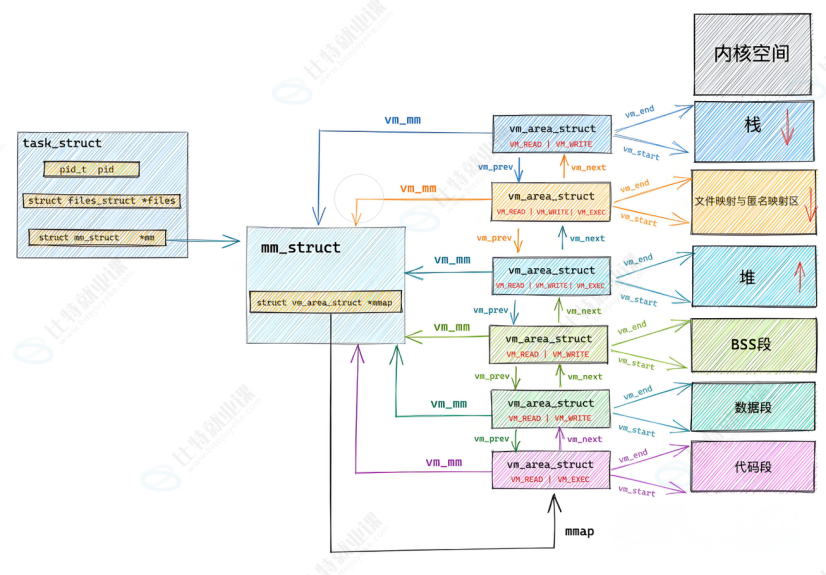 这是task_struct 到mm_struct,进程的地址空间的分布: