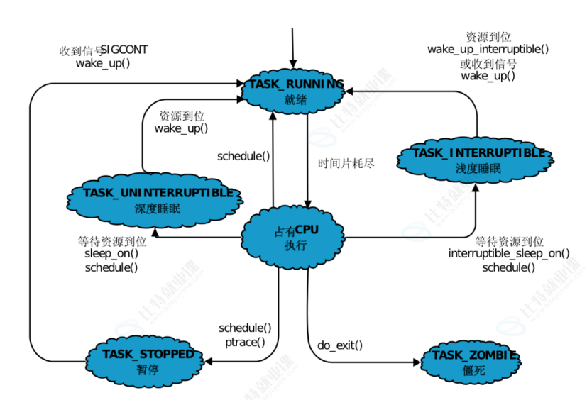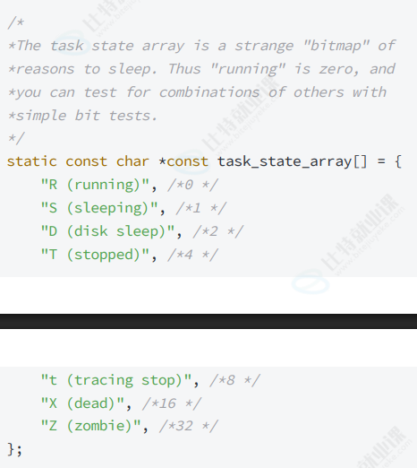 R运行状态(running):并不意味着进程一定在运行中,它表明进程要么是在运行中要么在运行队列中(在Linux中就绪状态和运行状态是被合并到了R状态里,因为对内核来说,在运行队列中等待CPU调度和正在被cpu调度都是可被调度的,但是区别于阻塞状态)
