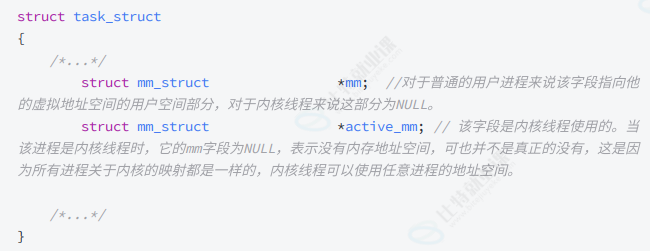 可以说mm_struct结构是对整个用户空间的描述,每一个进程都会有自己独立的mm_struct,这样每一个进程都会有自己独立的地址空间才能互不干扰