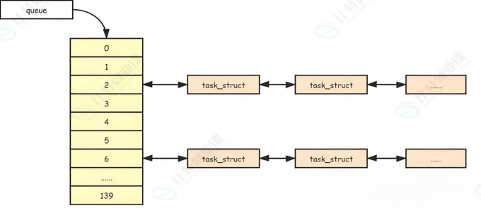 queue[140]: 140个优先级对应的双向链表,每一个链表对应一个优先级,数值越小优先级越高,相同优先级的进程FIFO顺序排队,调度时取队头进程,其中:0~99是实时进程优先级,100~139:普通进程优先级(对应nice值-20~19)