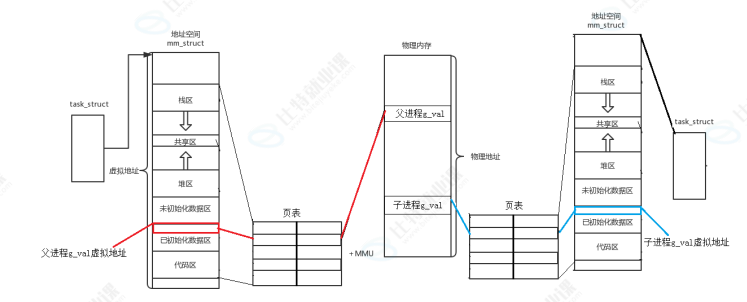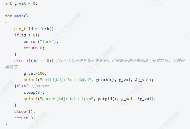 ①:变量内容不一样,所以父子进程输出的变量绝不是同一个变量