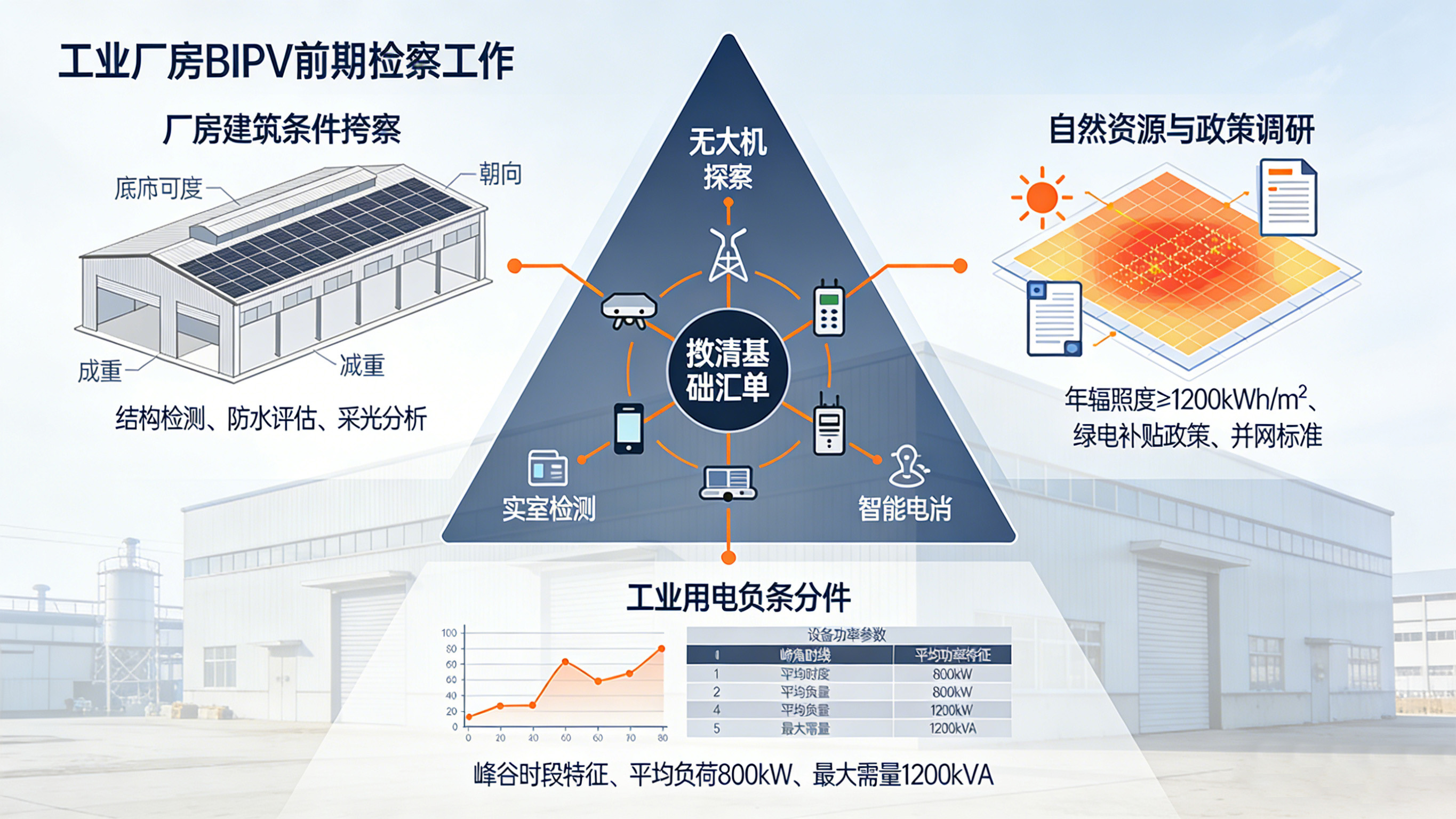 前期勘察是BIPV规划的核心前提,需从厂房建筑、自然资源、用电负荷三个维度全面收集数据,为后续系统设计提供依据,避免"盲目规划"导致的功能冲突或效益低下。