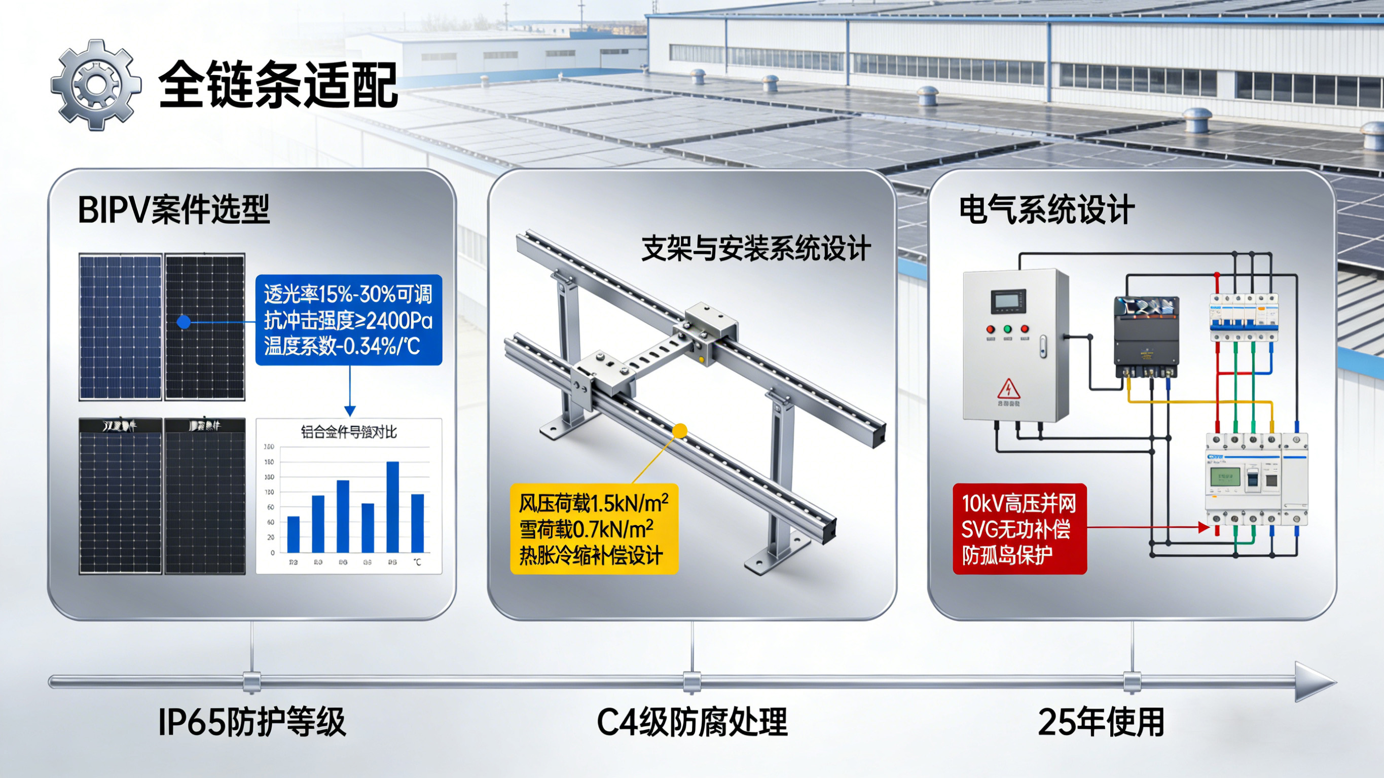 支架系统是连接BIPV组件与厂房建筑的核心,需兼顾承重安全、安装便捷性与屋面保护: